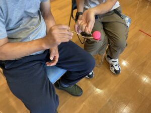 まだまだ残暑が続いていますが、デイケアでは季節を楽しんでいただこうと「手作り風鈴」を作りました。