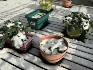 2月9日、今日はめずらしく雪が積もりましたね。プランターの野菜たちもすっぽりと雪化粧をして寒そうですが、冷たい雪の下でも力強く春を待っているように見えます。